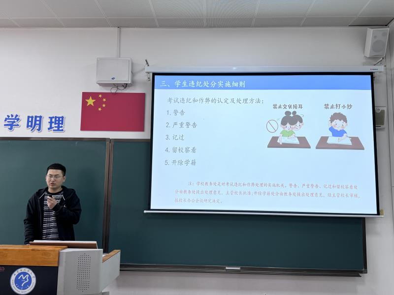 接着,鲍海英老师围绕学生行为与规范、宿舍卫生标准、学生违纪处分实施细则三个方面进行了详细讲解。特别强调了各项考试中坚持公平、诚信的重要性和必要性。考试不仅是衡量学术成就的关键手段,更是衡量个人品德的重要标准。她揭示了违规行为可能带来的严重后果,以此警示大家不要存在任何侥幸心理。并告知新生们日常请假流程,提醒同学们出行务必要重视个人安全,主动向指导教师或辅导员报告自己的行程安排。