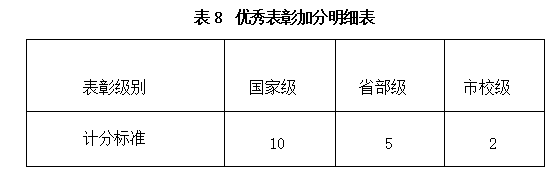 注:本项不同于竞赛获奖,为学生参加评优获得的荣誉称号如优秀青年志愿者、优秀学生干部等;因见义勇为、舍己救人拾金不昧等先进事迹而受表彰者。本项累加计分不超过10分
