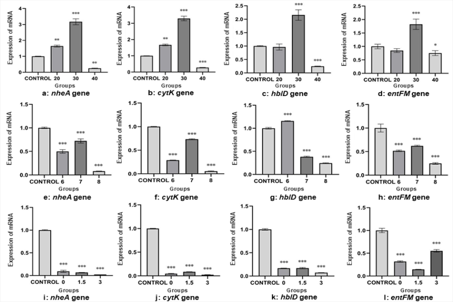 注:A、B、C、D分别为B. cereus的毒力基因(nheA、cytK、hblD、entFM)在不同环境下(20°C、30°C、40°C)的表达量。E、F、G、H分别为B. cereus的毒力基因(nheA、cytK、hblD、entFM)在不同pH下(6.0、7.0、8.0)的表达量。I、J、K、L分别为B. cereus的毒力基因(nheA、cytK、hblD、entFM)在不同盐浓度下(0 %、1.5 %、3 %)的表达量。以上所得数据为均值±标准差,其中*,P < 0.05;**,P < 0.01;***,P < 0.001 表示差异有统计学意义。