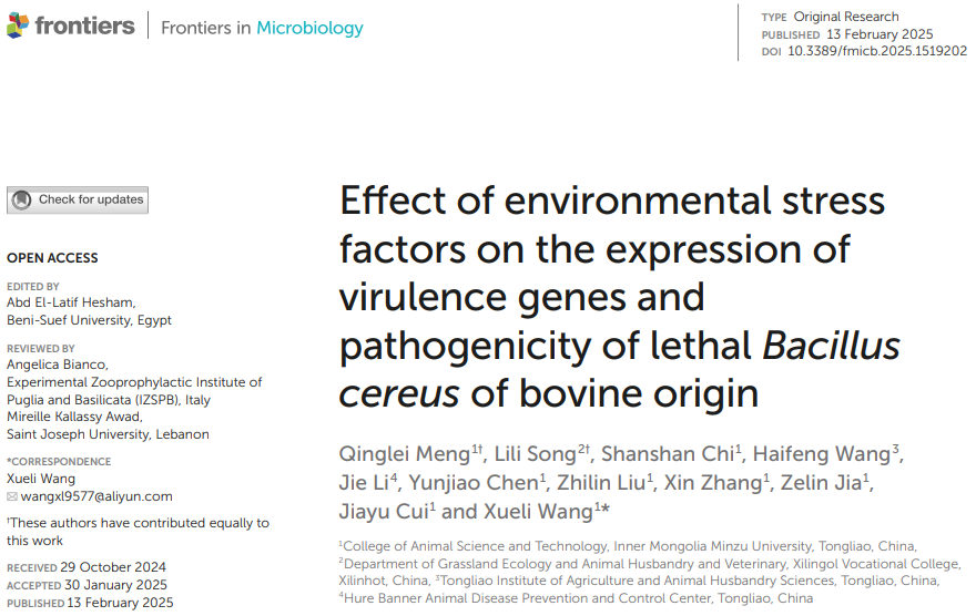 近日,我院王学理教授团队在生物学二区Top 期刊《Frontiers in Microbiology》发表题为“Effect of environmental stress factors on the expression of virulence genes and pathogenicity of lethal Bacillus cereus of bovine origin”的研究论文。动物科技学院2021级硕士研究生孟庆磊为第一作者,王学理教授为通讯作者。该研究通过环境胁迫因子降低蜡样芽孢杆菌的毒力基因表达水平,以降低蜡样芽孢杆菌对人和动物健康的危害。