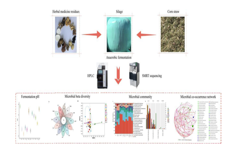 吴白乙拉博士的研究取得关键突破。本研究结果表明添加不同种类中药残渣能促进玉米秸秆的青贮发酵,降低酸性洗涤纤维、中性洗涤纤维和酸性洗涤木质素含量,增加乳酸、乙酸和丙酸含量。采用微生物组学技术首次揭示了不同中药残渣作用通过提高群落中植物乳杆菌和短乳杆菌相对丰度,降低地衣芽孢杆菌和枯草芽孢杆菌相对丰度,改善微生物群落结构、功能及其代谢产物。