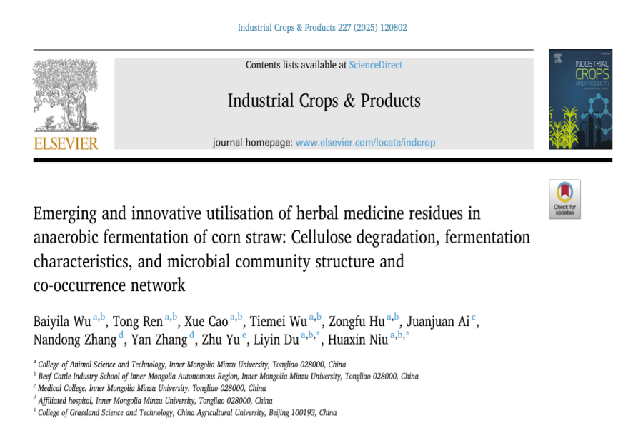 近日,我院吴白乙拉博士在国际知名学术期刊《Industrial Crops and Products》(中科院一区Top期刊,IF=5.6)发表了研究论文《Emerging and innovative utilisation of herbal medicine residues in anaerobic fermentation of corn straw: Cellulose degradation, fermentation characteristics, and microbial community structure and co-occurrence network》。该研究得到了内蒙古自治区留学人员创新创业启动支持计划项目、内蒙古自治区自然科学基金项目、内蒙古民族大学博士启动基金项目和内蒙古自治区青年英才项目的共同资助。
