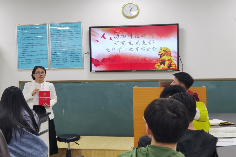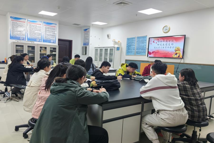 为了积极贯彻落实学校党的建设工作领导小组(扩大)会议精神,按照学校党委下发《关于在全校开展党纪学习教育的工作方案》具体要求,增强学生党员的纪律意识、规矩意识,引导学生党员知敬畏、存戒惧、守底线。动物科技学院研究生党支部于4月19日实验楼913室召开党纪学习教育部署会议。