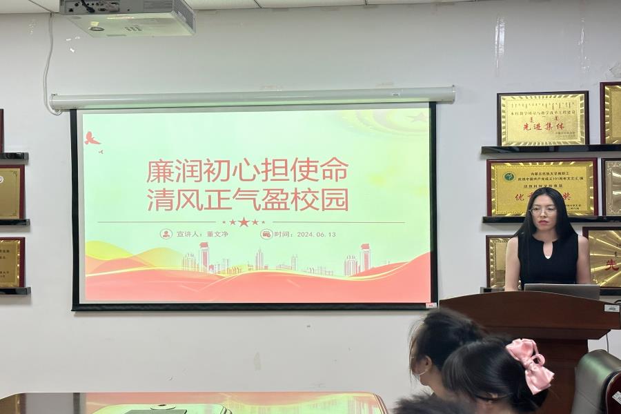 会上,董文净以《廉润初心担使命 清风正气盈校园》为题,坚持正面引导与反面警示相结合,从开展党纪学习教育的目标和意义,坚守入党初心,涵养清风正气三个方面展开讲述。她教育党员学生要增强纪律意识和规矩意识,懂法纪、明规矩、知敬畏、存戒惧、守底线,切实把遵规守纪刻印在心、见之于行,自觉把党纪党规转化为日常习惯和行动准绳。她要求党员学生要真正使学党纪的过程成为增强政治意识、纪律意识的过程,为全院学生立好标杆、当好表率,营造风清气正的校风学风。