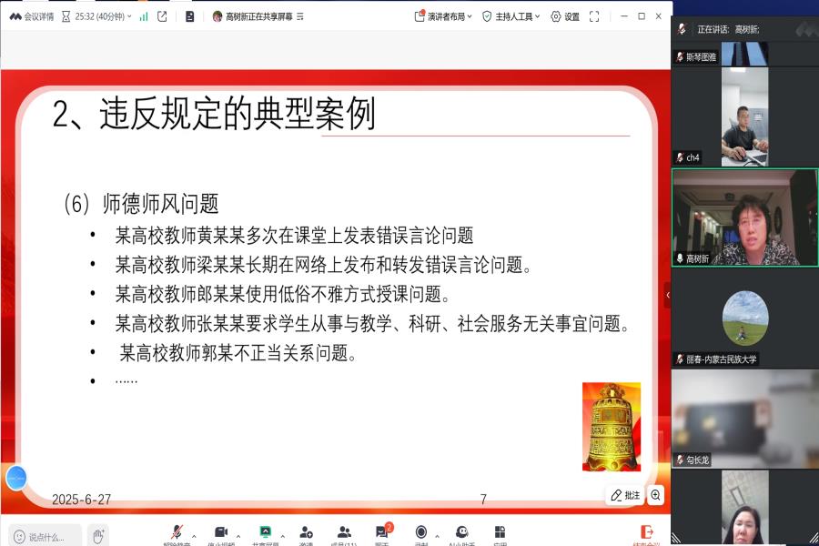 为深入贯彻中央八项规定精神,持续深化作风建设,6月27日,教师第一党支部在腾讯会议平台开展“纪律作风党课”专题党课。会议由党支部书记高树新主持,支部全体党员参加。