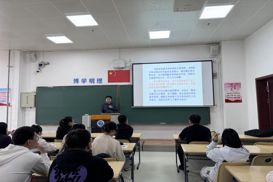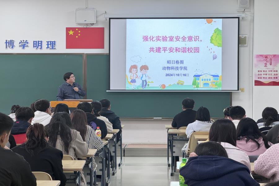 为进一步完善学院安全管理机制,推动学院安全管理工作行稳致远,切实提升学生的安全意识和应对突发事件的能力,动物科技学院于10月17日在实验楼303召开实验室安全专题讲座。学院党委副书记昭日格图出席大会并作实验室安全专题讲座。学工办主任鲍海英、研究生班主任盖微微、王雪奇及2024级研究生参加大会。会议由学工办主任鲍海英主持。