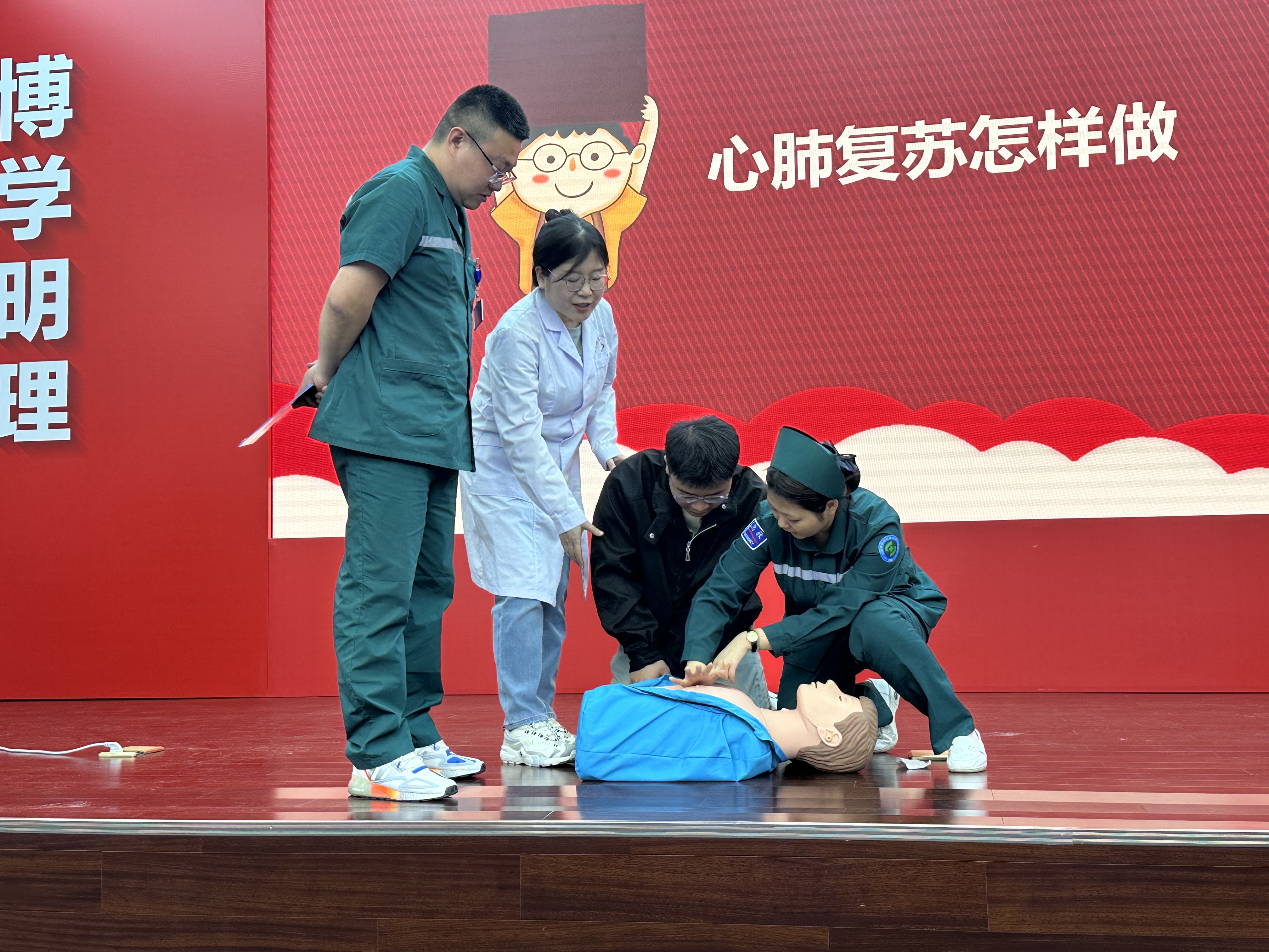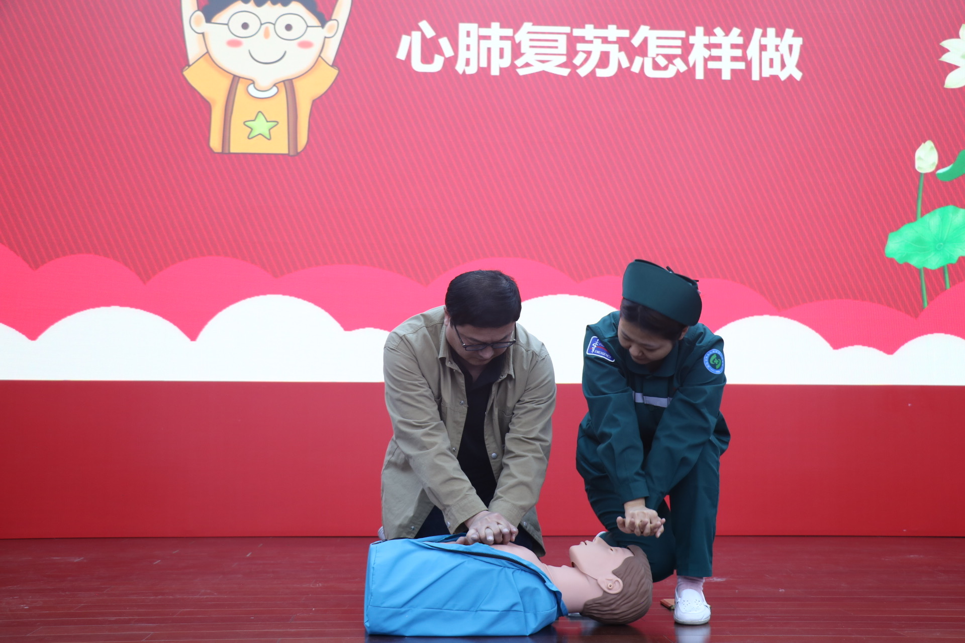 讲座中,以急诊科主任温泉、护理部副主任刘妍为代表的专家团队向大家详细讲解了海姆立克急救法、心肺复苏以及急救包扎的相关知识,并由各科室优秀工作者们向大家现场演示这些急救技能的具体操作。每次讲解与演示完毕,在座师生均积极上台体验急救技能模拟操作,过程中,医护人员们耐心指导,认真纠正老师与同学们在操作中的错误。整个过程生动有趣,参与到其中的师生纷纷表示在这短短的体验时间中,他们不仅学习到急救技能,同时也切身感受到急救工作中时间的紧迫感、复苏抢救的模拟真实感以及医护人员的辛苦与不易。