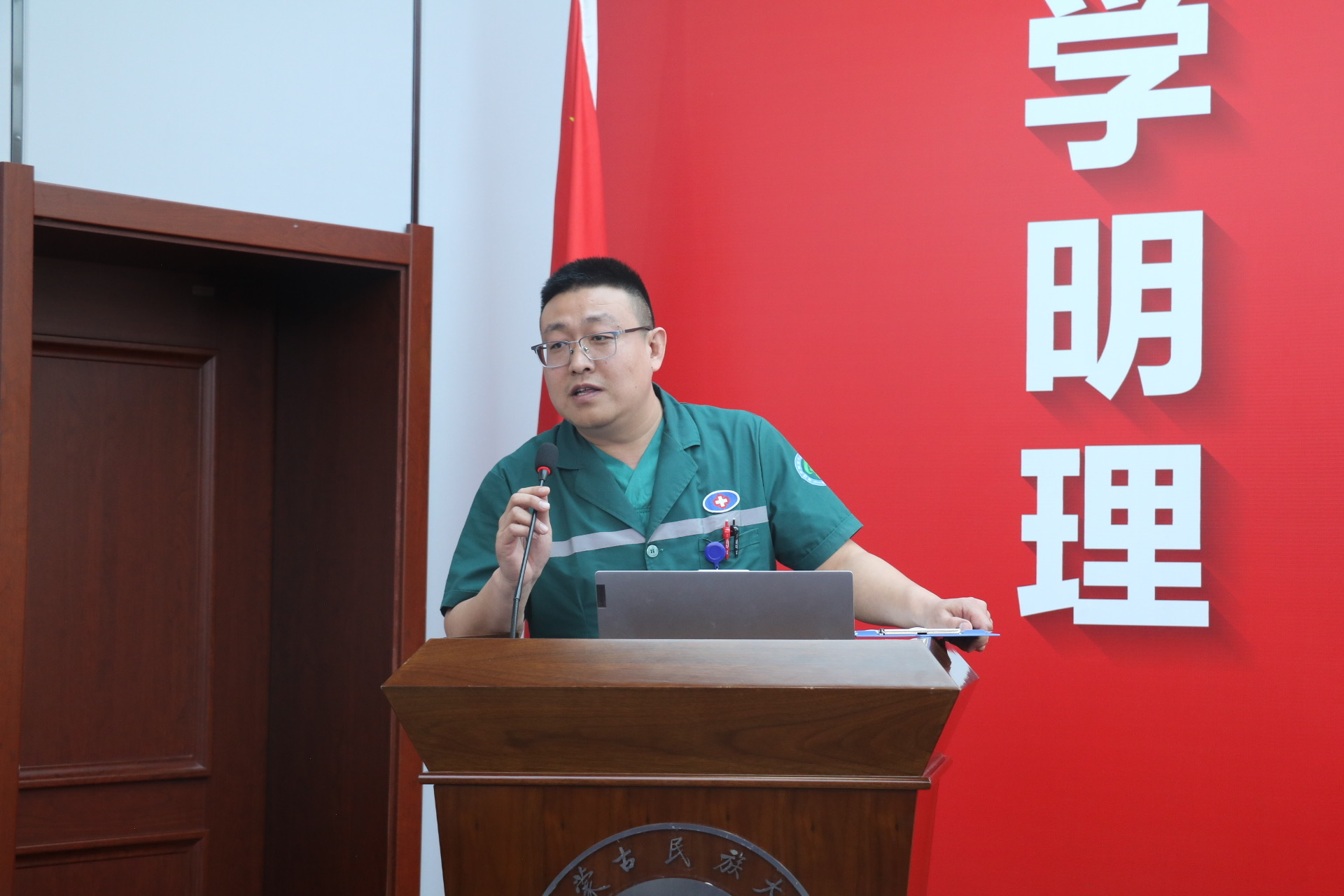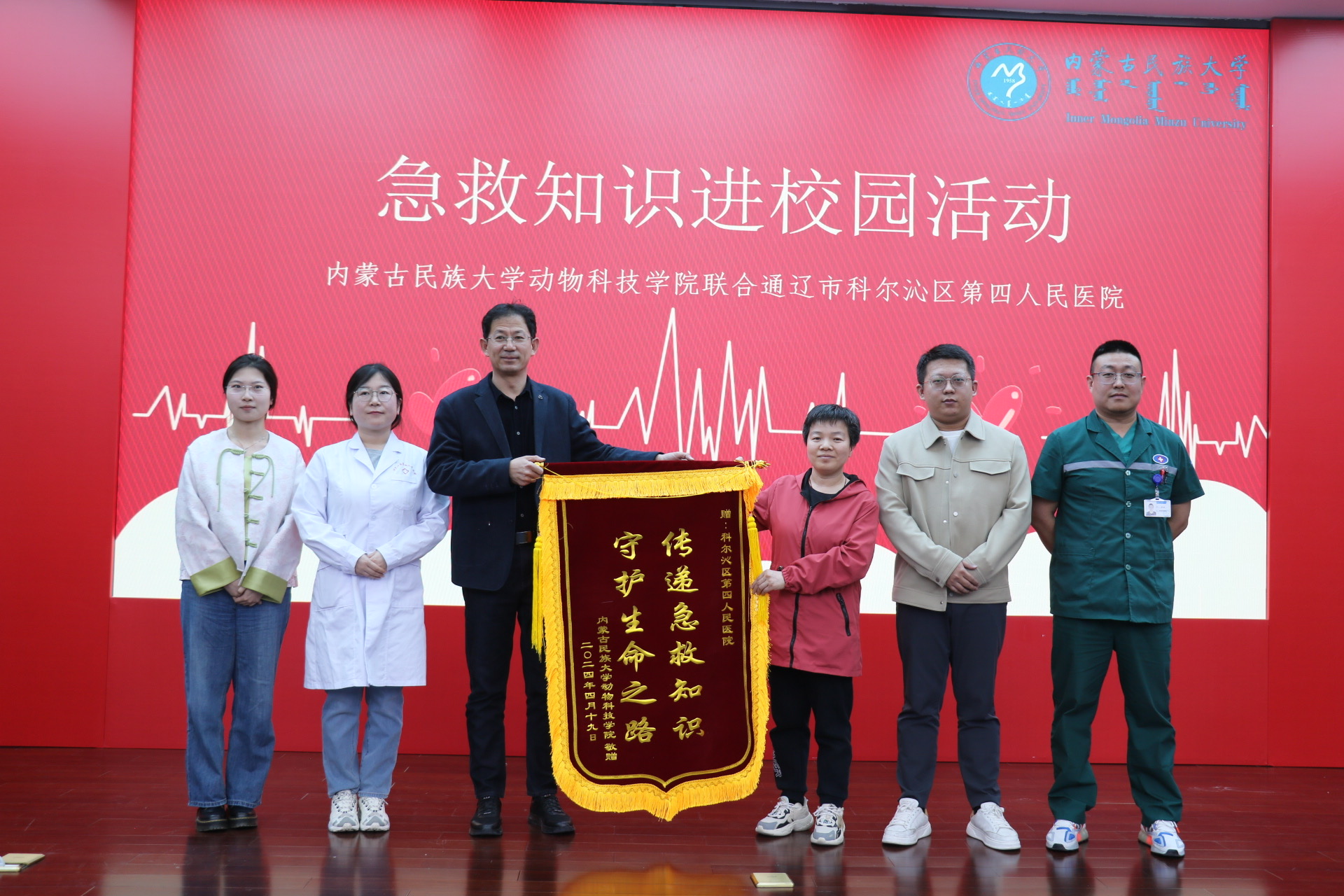 动物科技学院党委书记包兰英对前来开展讲座的科尔沁区第四人民医院专家团队表示了衷心感谢,并表示使师生掌握急救技能是实现健康中国行动的有力抓手,此次培训对我院师生普及急救知识和掌握生存必备技能十分重要的意义,希望学院与医院更进一步的交流与合作,增加学院急救知识的普及宣传力度,提升师生安全意识,切实将安全教育落深落实。最后,杜立银为科尔沁区第四人民医院专家代表颁发锦旗并合影。