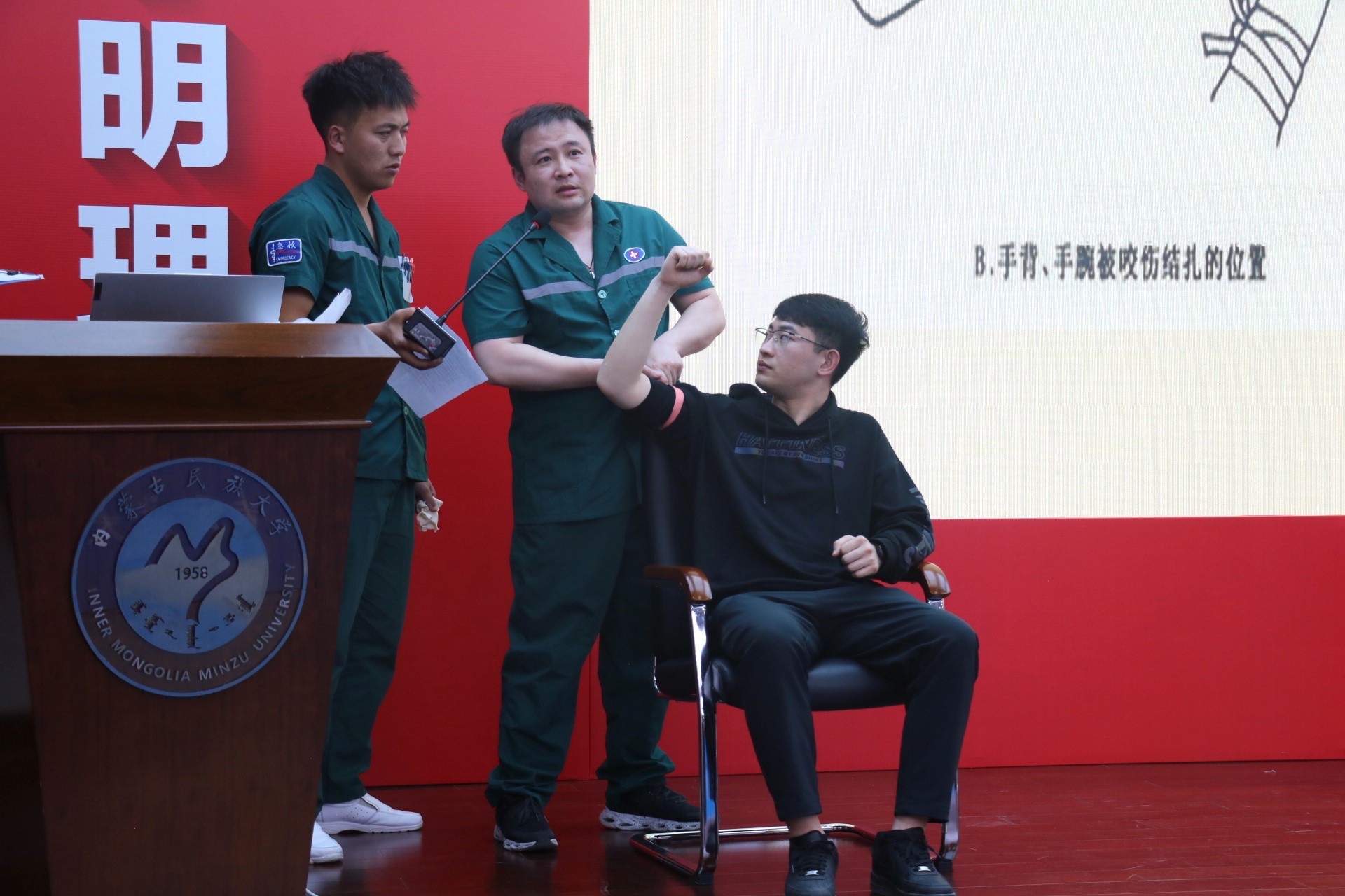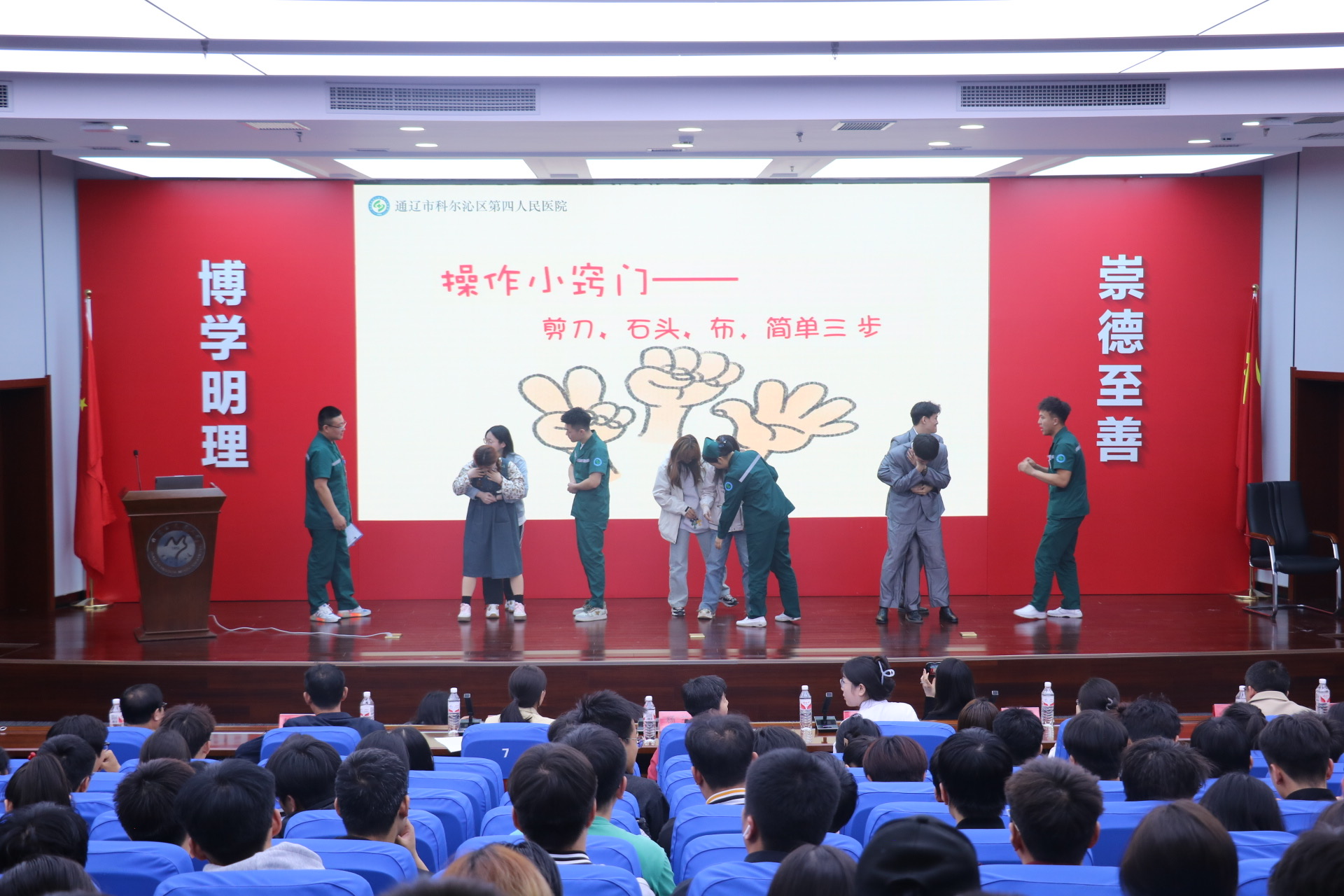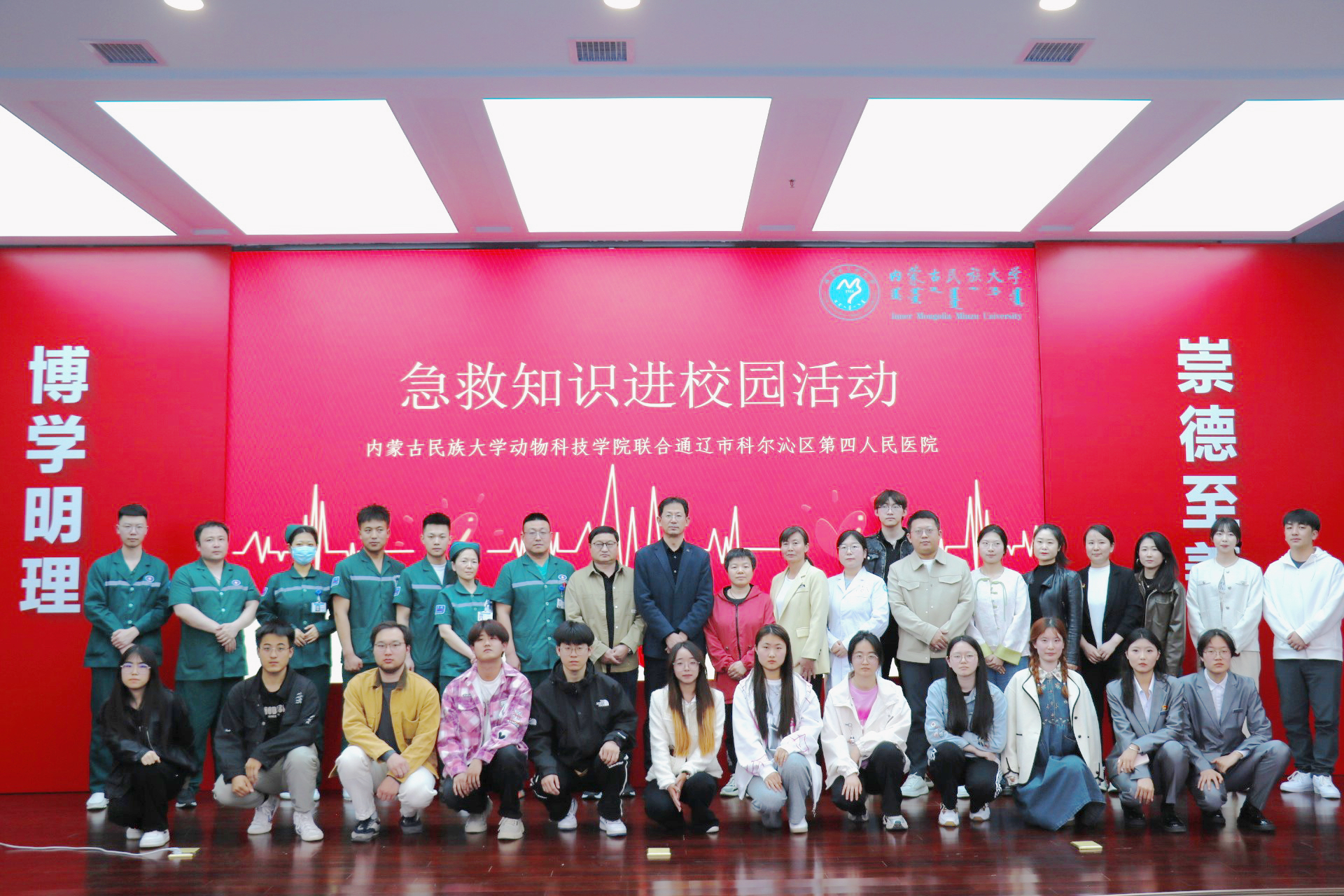 为提高全院师生应对突发事件和意外伤害事故的自救和他救能力,进一步提升师生安全教育素养,着力讲好“六句话的事实和道理”,重实功求实效,积极引导党员群众在感党恩听党话跟党走上当标杆,推动“感党恩、听党话、跟党走”群众教育实践活动取得实效,4月19日,动物科技学院联合科尔沁区第四人民医院在图书馆大报告厅开展急救知识讲座。动物科技学院党委书记包兰英、院长杜立银、党委副书记昭日格图、科尔沁区第四人民医院医务科主任杨兰、第二党支部书记郝岳、第三党支部书记、护理部主任关娟、护理部副主任刘妍、急诊科主任温泉、急诊科护士长张丹杰、神经内科护士长王东梅、血透室护士长孟凡茹、检验科主任王帅及各科室优秀工作者18名医生护士以及学院团总支书记董文净、辅导员藏小文以及各班级学生代表200多人参加。本次讲座由辅导员邢家辉主持。