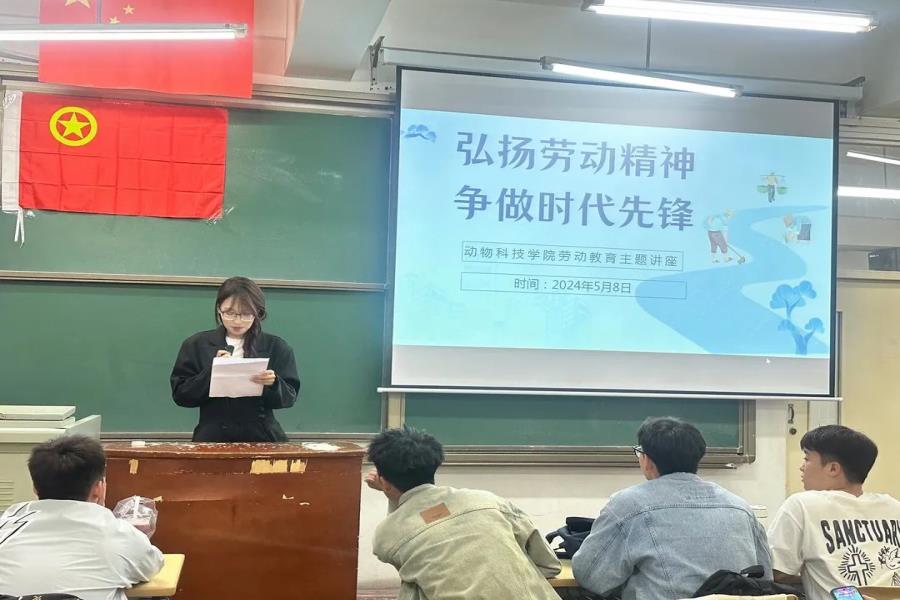为提高对劳动价值的认识和尊重,营造崇尚劳动、尊重劳动的校园氛围,动物科技学院于5月4日举办“弘扬劳动精神,争当时代先锋”主题讲座。本次活动由主席团成员杨阳主持,主席团成员与学生会部分学生参加本次活动。