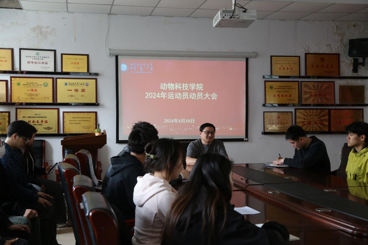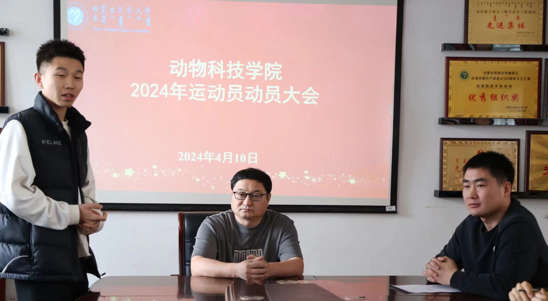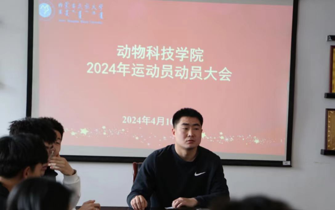 为迎接即将到来的校田径运动会,4月10日,动物科技学院召开运动会动员大会动物科技学院党委副书记昭日格图、辅导员藏小文以及教练员和全体运动员共同出席此次会议。