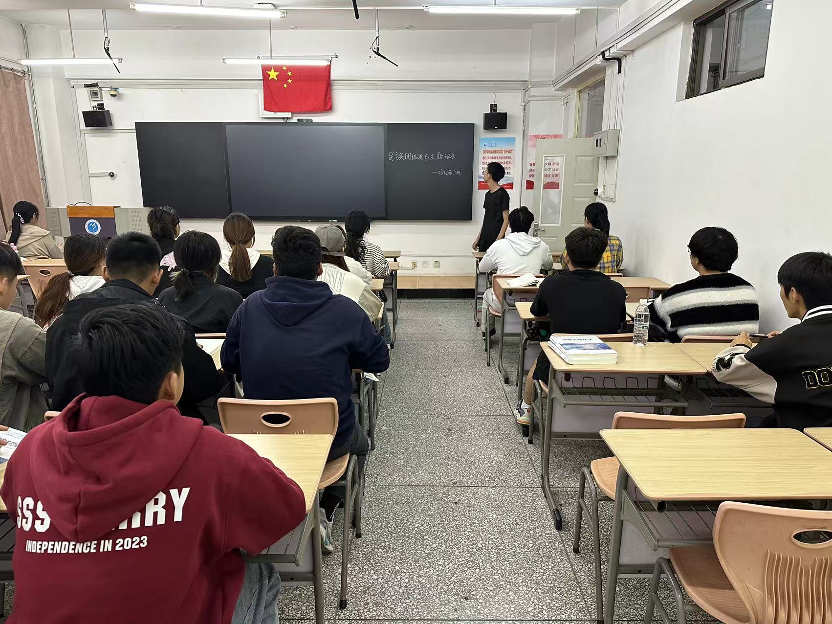 班会上,各班班主任先从中华民族共同体的内涵、意义以及铸牢中华民族共同体意识的重要性等方面进行细致地宣讲,让同学们明白中华民族是一个共同荣辱、命运相连的共同体。接着,各班班主任讲解了我国的民族政策,告诫同学们要遵循坚持民族平等、民族团结和各民族共同繁荣的基本原则,明确民族区域自治制度,保障各民族合法权益。