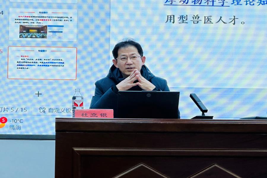 首先杜立银从肉牛产业学院动物医学专业的建设背景、意义、培养目标、课程体系设置及未来发展等方面进行招生宣讲。