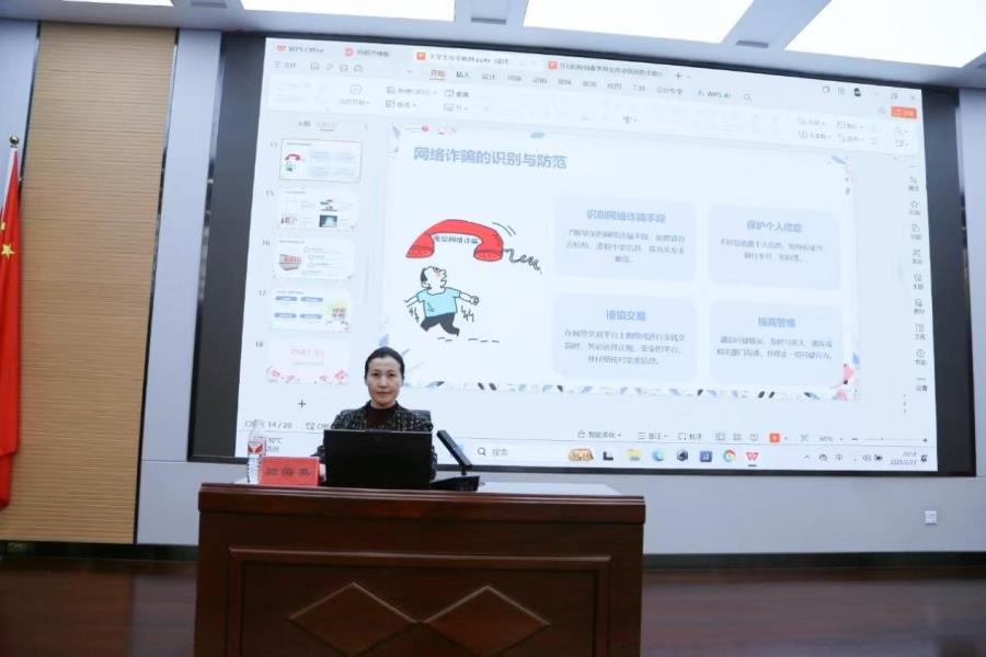 由鲍海英就校园安全的五个方面进行培训。一、安全教育的重要性。强调学生应增强自我保护意识,学习安全知识,识别危险情境,预防意外事故,并养成良好安全习惯。第二、校园安全知识普及。详细讲解了火灾预防、实验室安全、体育活动防护及校园欺凌防范等知识。三、网络安全与防范策略。针对网络诈骗、个人隐私保护等多方面给出具体防范策略,提醒师生谨慎对待网络信息。四、交通安全。强调遵守交通信号、文明乘车等规则,以及骑行和驾驶的安全要点。五、心理健康与安全教育。阐述了心理健康对大学生成长的重要性,并分享了心理压力调节和建立良好人际关系的方法。