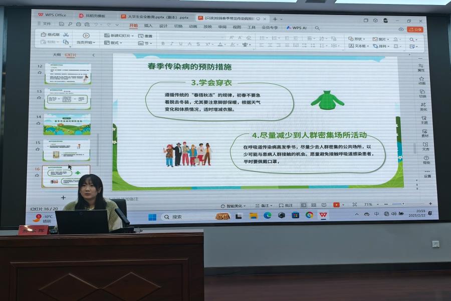 邢家辉通过多维解析就春季传染病预防展开系统讲解。首先从流行病学角度深入剖析春季传染病高发机理,指出气温波动、病原微生物活跃、黏膜屏障功能下降及人员流动频繁四大诱因;继而聚焦校园防控实际,通过临床症状比对和传播途径解析,重点讲授流行性感冒、腮腺炎、诺如病毒感染等常见传染病的鉴别要点,并结合临床案例强化师生风险意识;最后提出科学防控指南,强调保持良好个人卫生习惯、规范佩戴口罩、确保室内通风、加强体育锻炼、保证充足睡眠等九大防护措施,特别提醒出现发热、呕吐、严重腹泻等症状应及时就医,杜绝带病上课。