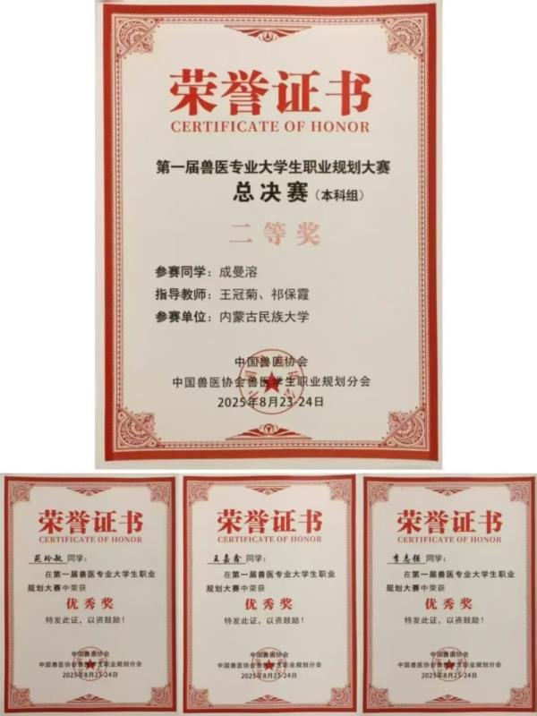 8月23-24日,由中国兽医协会主办的第一届兽医专业大学生职业规划大赛总决赛在西安国际会展中心成功举行,由我院王冠菊、祁保霞两位老师指导的动物医学专业2020级本科生成曼溶凭借出色表现斩获二等奖。同时,我院动物医学专业本科生苑玲敏(2022级)、王嘉鑫(2021级)和李志强(2021级)在初赛中获得优秀奖。