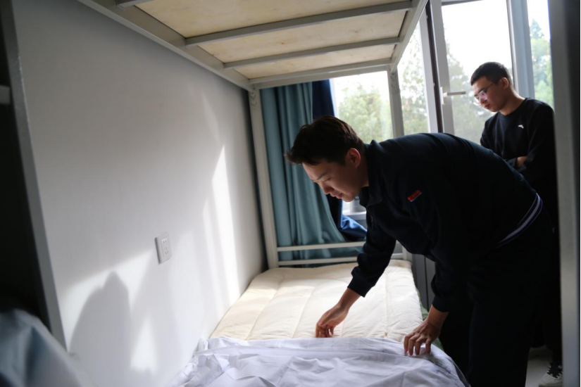 活动现场,辅导员详细解读住宿管理规定与安全注意事项等核心内容,我院退伍军人学长和校国防团学姐随后开展现场叠被教学。针对“豆腐块” 被子的叠法,他们分步演示、细致讲解技巧,让新生直观感受内务规范标准,不少同学当场表示 “学到了!” 除集中演示外,工作人员还深入每间宿舍开展 “一对一” 讲解,围绕新生关切的用电安全、物品摆放、公共区域维护等问题详尽解答,同时耐心倾听同学们的个性化诉求。面对面沟通不仅传递了规范,更让新生感受到学院温情,现场氛围融洽、互动热烈。这种直观细致、充满温度的讲解,让新生清晰认知宿舍生活规范,有效缓解了初入新环境的陌生感与不安。宿舍是学生在校的“家”,也是校园生活的重要基石。