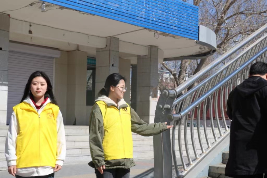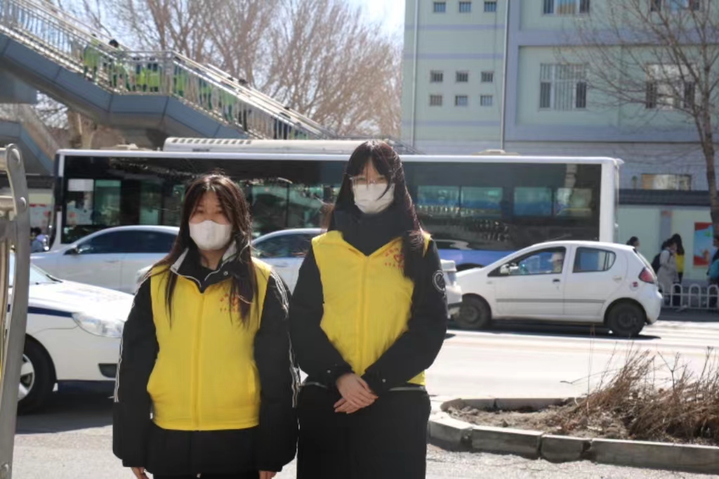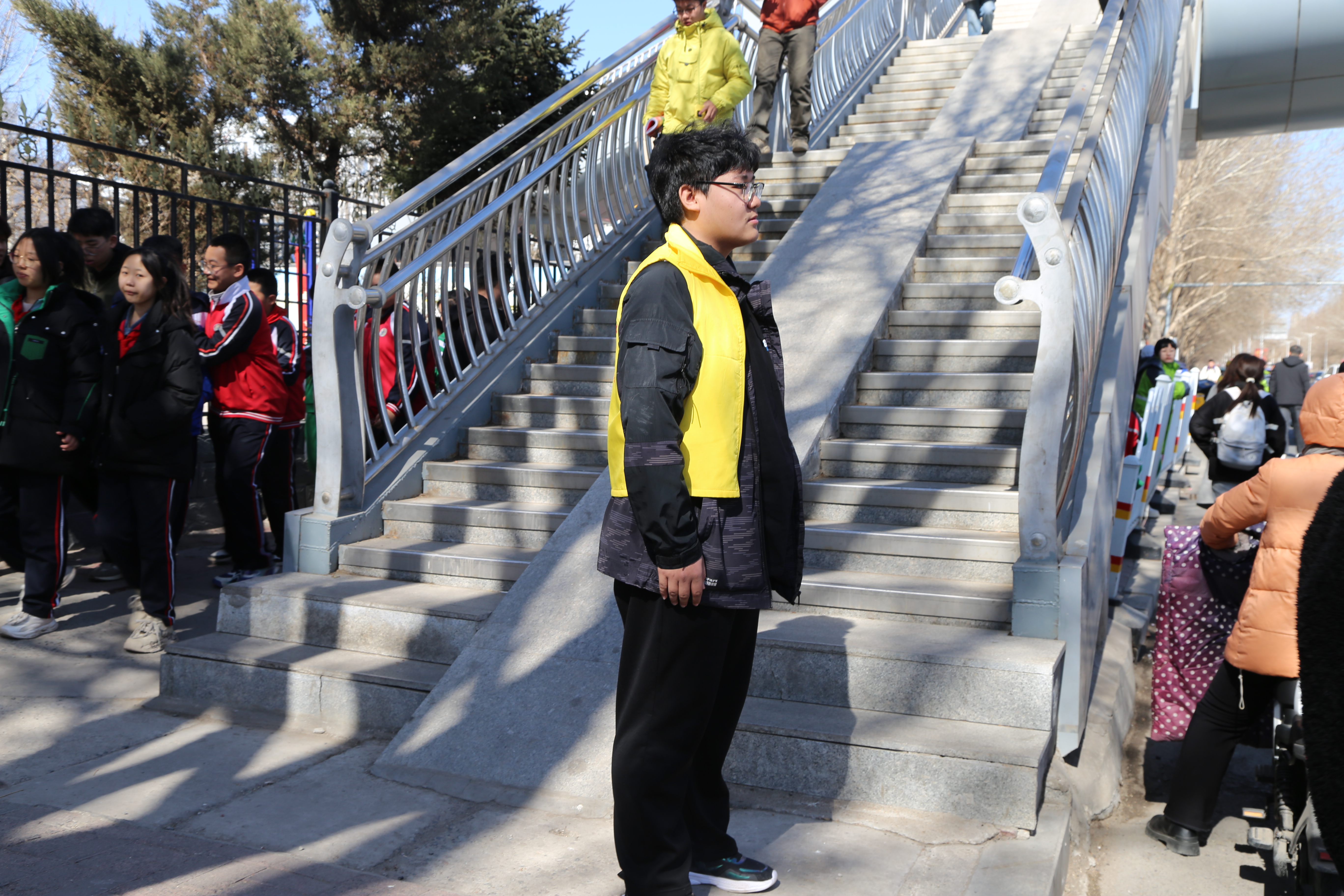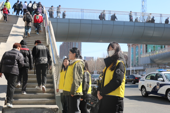 在上下课行人往来的高峰时段,志愿者们在紧邻我校霍林河校区西门、西拉木伦校区南门的两个过街天桥上下口处,劝导来往通行的学生走天桥,提醒大家走天桥时不拥挤,不推搡,不打闹,不逗留,不嬉戏,不攀爬,以确保自身和他人的安全。此外,对翻越护栏,横穿马路的同学,耐心提示违规出行的隐患和危害,宣传安全交通知识。