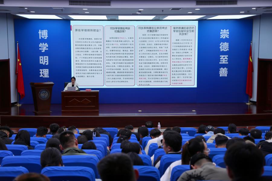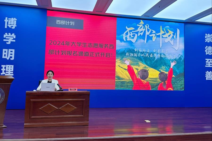 为深入学习贯彻习近平新时代中国特色社会主义思想,认真贯彻落实党中央对“大学生志愿服务西部计划”的系列指示精神,号召更多大学生志愿者走进乡村、投身基层,服务乡村振兴战略,4月28日,动物科技学院在图书馆大报告厅开展西部计划宣讲活动。动物科技学院党委副书记昭日格图、辅导员藏小文和2024届毕业生参加活动。活动由团总支书记、本科生第二党支部书记董文净主持。