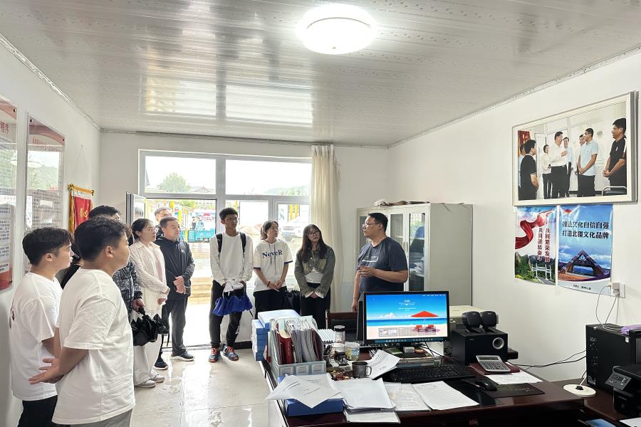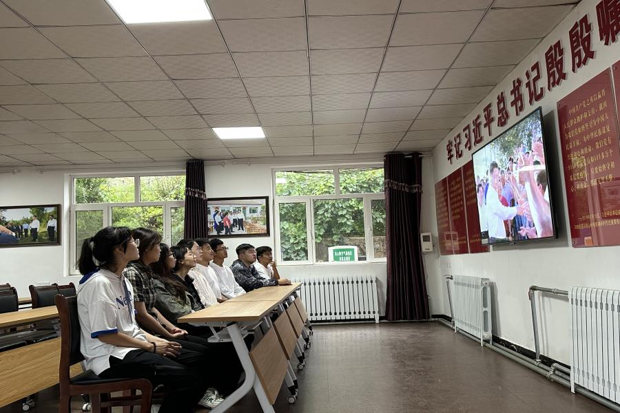 随后实践团来到赤峰市喀喇沁旗河南街道马鞍山村,感受马鞍山村干部职工群众牢记嘱托、凝心聚力、感恩奋进,推动乡村发生的全面深刻、鼓舞人心的新变化。乌晓亮书记向大家介绍了马鞍山村的基本情况、发展思路以及习近平总书记考察时的故事。几年来,马鞍山村各族干部群众牢记总书记殷殷嘱托,厚植绿色优势、擦亮红色印记、做强紫色产业,逐步走出了一条符合村情的生态立村、产业富村、旅游强村之路。在党群服务中心会议室,实践团成员共同观看了习近平总书记考察喀喇沁旗马鞍山时的视频剪影。