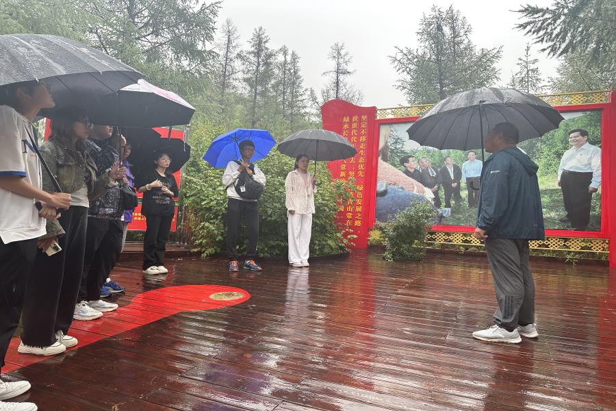 12日下午,小雨淅淅沥沥,沿着崎岖的盘山路,实践团来到赤峰市喀喇沁旗马鞍山林场。一下车,“绿水青山就是金山银山”的标语便映入眼帘,这里也是习近平总书记来到赤峰时考察的一站。穿行在绿意葱茏的马鞍山林场,站在习近平总书记曾站在的地方,林场工作人员向大家介绍了林区基本情况,讲述习近平总书记考察时的现场全过程。习近平总书记强调“守好这方碧绿、这片蔚蓝、这份纯净,要坚定不移走生态优先、绿色发展之路。”如今的马鞍山林场,人工造林面积5000余亩,景区周围重点地段森林覆盖率达到98.68%,昔日的荒山秃岭已变成如今的绿地海洋。在这里,实践团成员充分认识到“绿水青山就是金山银山”这一绿色发展理念的重大意义。