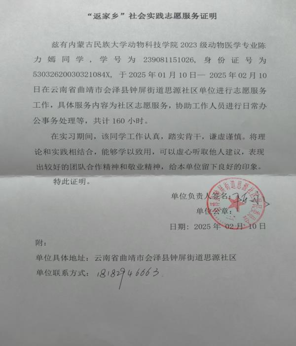 2025年1月10日-1月25日,社区开展留守儿童义务托管服务,作为教师志愿者辅导孩子完成作业,陪伴孩子进行趣味活动和科技馆参观等。1月25日-1月27日,在托管班放假期间,协助社区工作人员汇总贫困家庭收入情况材料。2月3日-2月10日,协助社区工作人员开展文件处理、组织活动以及参与社区环境整治等日常办公事务。