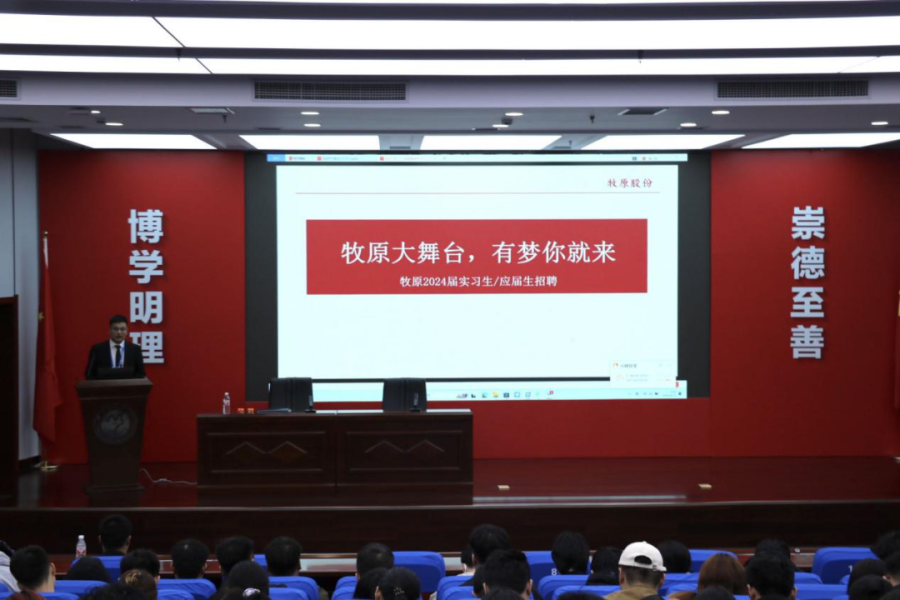 会议开始牧原集团修占将为各位到场同学播放牧原智能化讲解视频及牧原公司发展历程视频。通过PPT,讲述行业发展趋势,并通过两个案例告诉学生应届毕业生就业的重要性,激发了同学们的兴趣和思考。期间,学生积极参与问答,现场气氛活跃。期间由23级毕业生包塞娜,为学院学弟学妹分享自己就业历程、工作经历、求职技巧及牧原集团对就业人员的重视,同时鼓励大家面对工作要吃苦耐劳、踏实能干、积极向上。最后辅导员藏小文老师对本次宣讲会进行了总结发言。