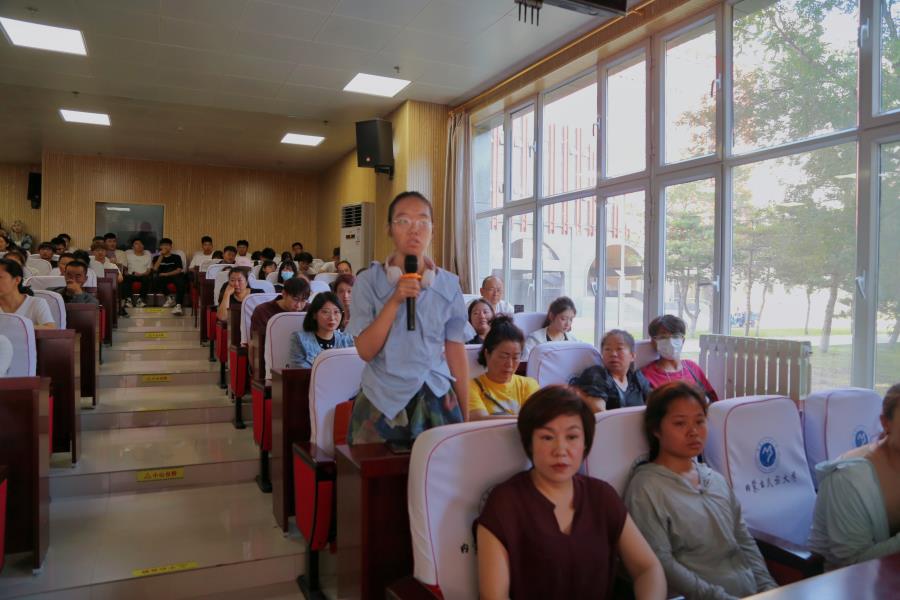学院学生工作办公室主任鲍海英介绍了学院学生工作特色,学生工作的近期安排,她希望新生转变角色尽快适应大学生活。在交流和提问环节中,新生及家长与学院领导、老师互动答疑,学院相关负责人对此作出了详细全面的解答,现场氛围热烈。