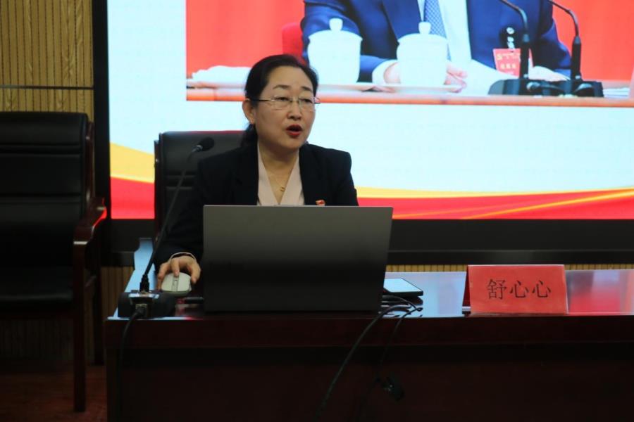 会上,舒心心围绕党的二十届三中全会是在以中国式现代化全面推进强国建设,民族复兴伟业的关键时期召开的一次十分重要的会议;深入学习领会习近平总书记在党的二十届三中全会上的重要讲话精神;全面准确理解《决定》提出的进一步全面深化改革的重大举措;深入贯彻落实自治区党委十一届八次会议精神,书写中国式现代化内蒙古的新篇章等四个方面,她结合具体数据和生动案例全面展示了党和国家事业在国家安全等多个领域取得的重大成就,解读了党的二十届三中全会取得的重要成果,并深刻阐述了全会对于全面深化改革、推动中国特色社会主义制度自我完善和发展的重要意义,深入学习领会全会精神。
