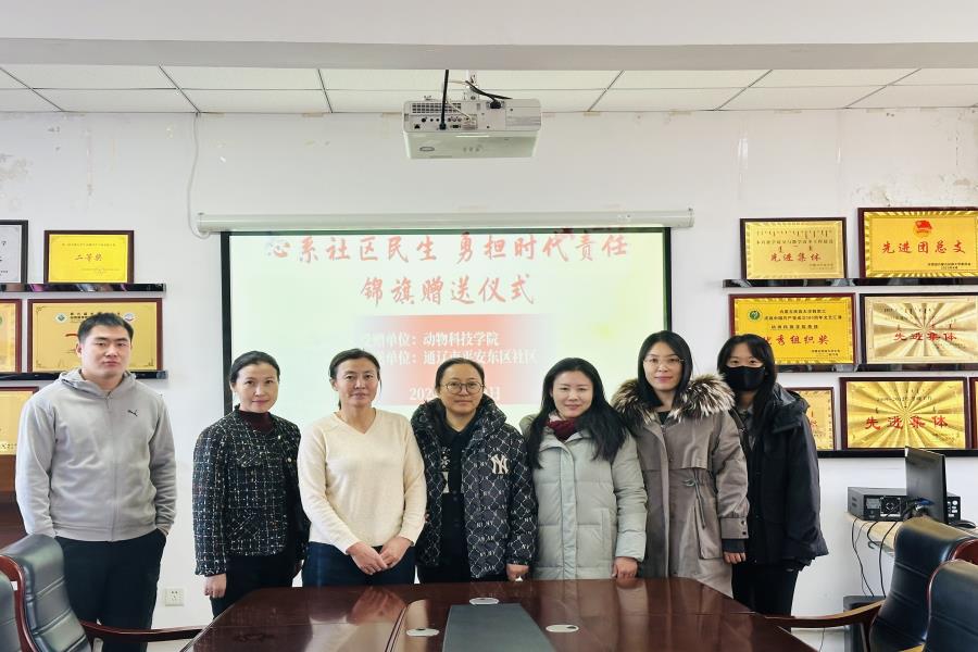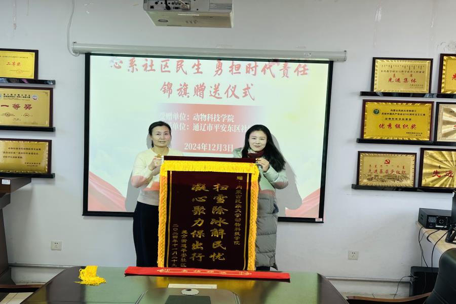 赵红亲手将锦旗递交到包兰英手中,热情洋溢地说:“作为动物科技学院“大学生社区实践计划”的对接单位,自2023年10月起学院学生持续开展了社区环境清洁、扫雪除冰、宠物养护宣讲等一系列志愿服务活动。这次赠送锦旗,不仅是对动物科技学院长期以来给予社区支持和帮助的感谢,更是希望借此机会强化工作协同,加强校地合作,共同为构建和谐美好的生活环境贡献力量。”