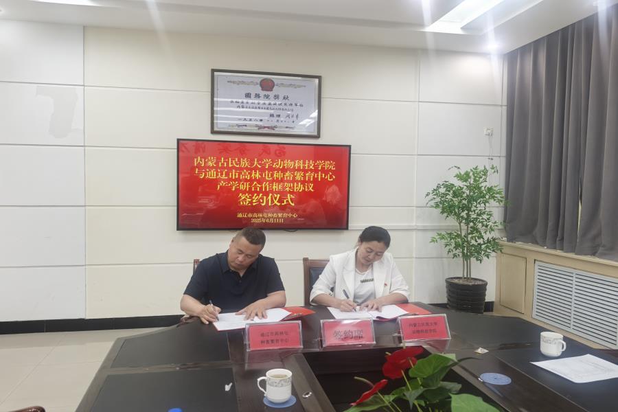 会议上,中心主任季守财致欢迎词并介绍通辽市高林屯种畜繁育中心发展历史、核心职能、组织架构和肉牛核心育种场养殖等情况。包兰英围绕学院学科优势、师资力量、近年取得的育种科研成果及服务地方产业的合作定位进行阐述。随后,双方围绕肉牛产业技术创新、饲草料研发、育种改良、疫病防控等产业痛点开展深度研讨,明确了“优势互补、资源共享、协同发展、互利共赢”的合作原则,之后签署了产学研一体化合作框架协议,并为“内蒙古民族大学研究生培养基地”揭牌。