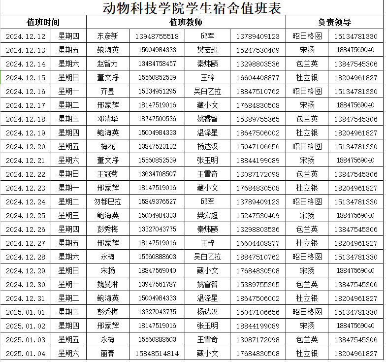 动物科技学院学生宿舍值班表